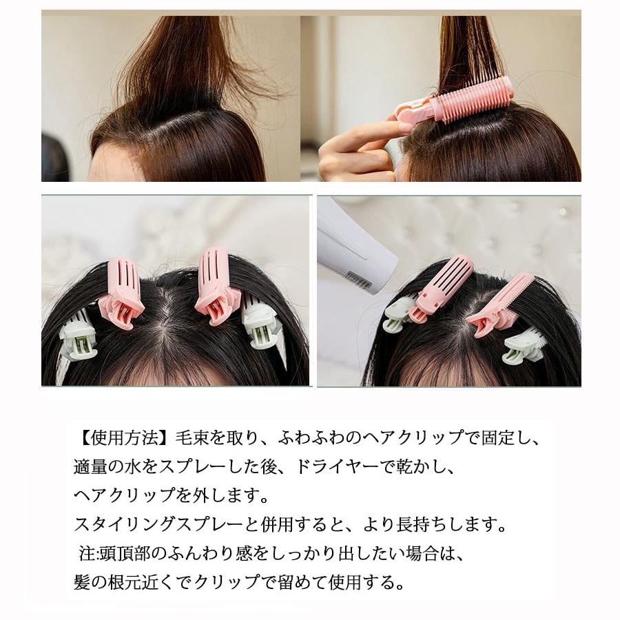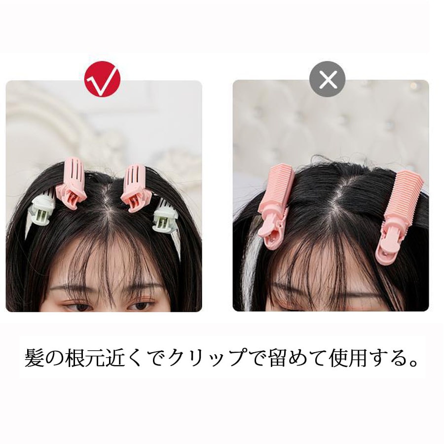 【使用方法】毛束を取り、ヘアクリップで固定し、適量の水をスプレーした後、ドライヤーで乾かし、ヘアクリップを外します。 スタイリングスプレーと併用すると、より長持ちします。 注:頭頂部のふんわり感をしっかり出したい場合は、髪の根元近くでクリップで留めて使用する。