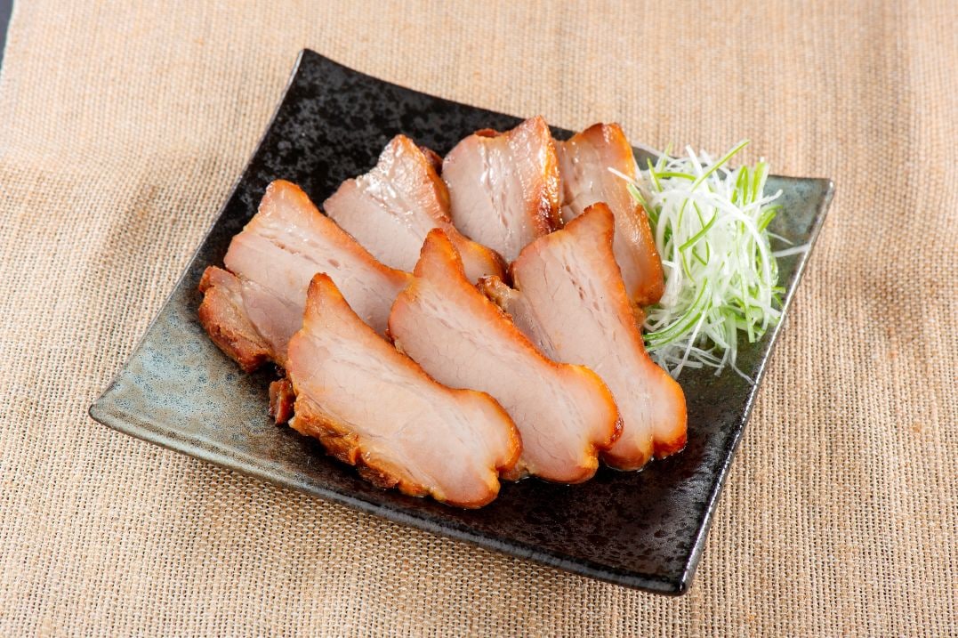 豚ばら肉を独自に調合した甘口のたれに2日以上じっくりと漬け込んでから、一本一本丁寧につるして直火釜で香ばしく焼き上げています。中まで味がしっかりとしみ込んで、噛むほどにうま味があふれます。煮豚ではなく、焼豚本来の製法で作っているので、肉の歯ごたえを楽しめる本格的な味わいです。