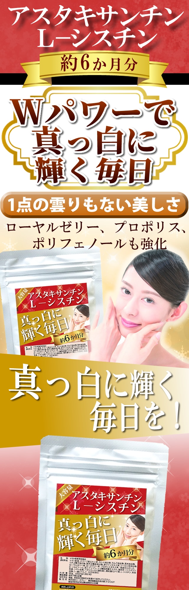アスタキサンチンとL-シスチンのWパワーが更に輝く美しさに導いてくれます。