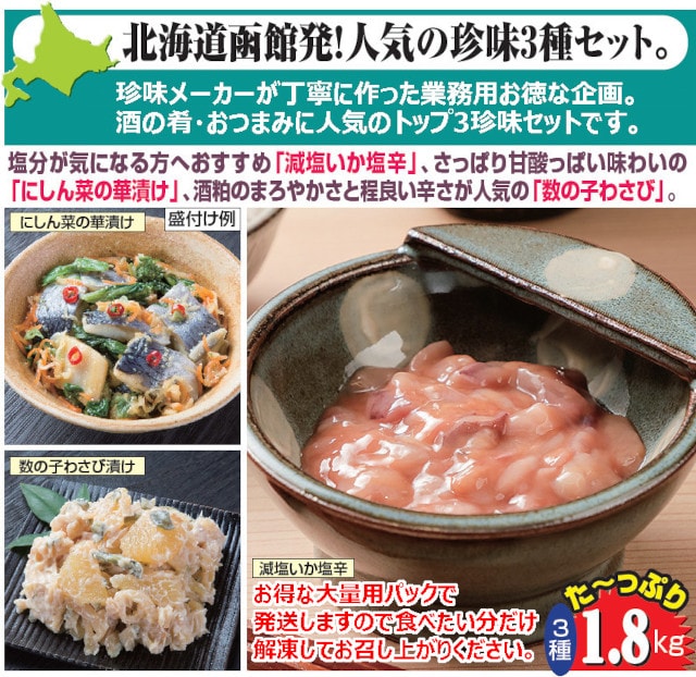 【1.8kg】北海道産函館発!酒の肴3点セット | 北海道函館発!人気の珍味3種セット。
