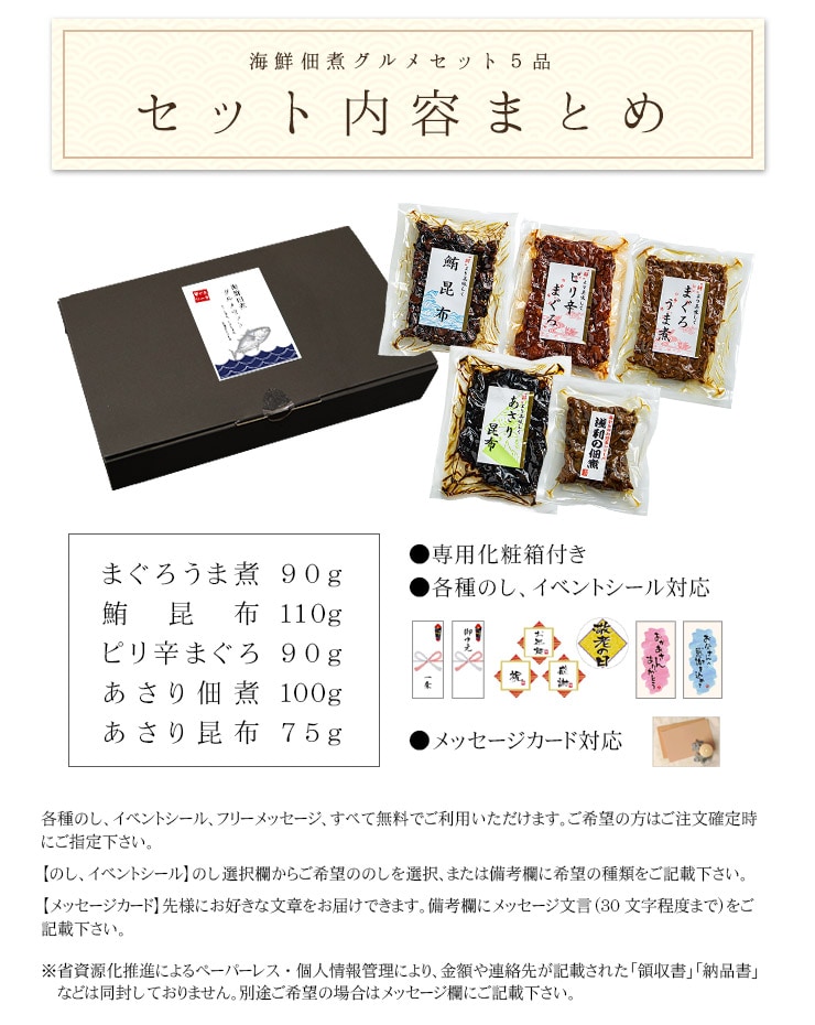 - 海鮮佃煮5種グルメセット (まぐろ佃煮、あさり佃煮) [[まぐろ佃煮グルメセット]