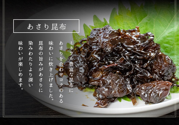 【あさり昆布】あさり(中国)、醤油(小麦・大豆を含む)、砂糖、昆布、醸造調味料、麦芽水飴、鰹節エキス、食塩、寒天/調味料(アミノ酸等)、カラメル色素、保存料(ソルビンK)、甘味料(ステビア)、酸味料