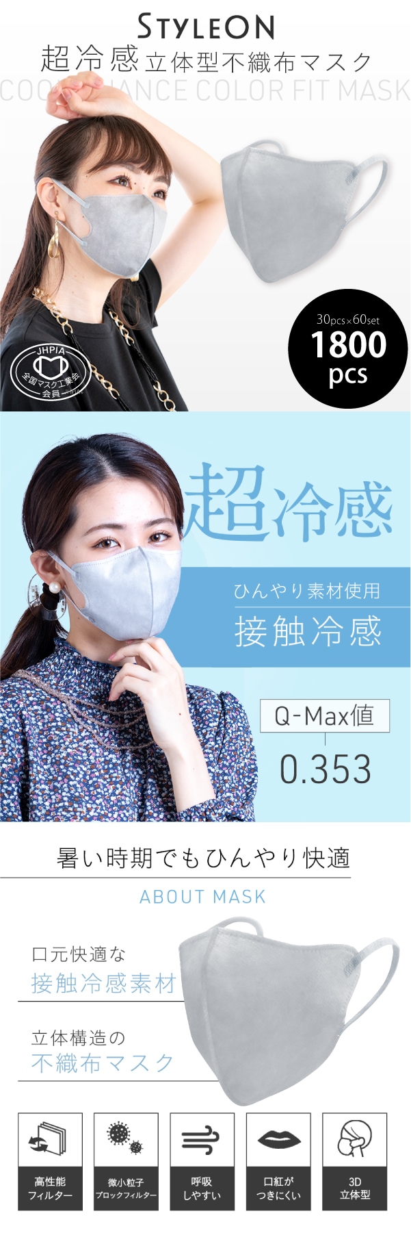 【スカイグレー/30枚入×60箱セット】STYLE-ONクールニュアンスカラーフィットマスク | 大容量1800枚!毎日使える高コスパマスク