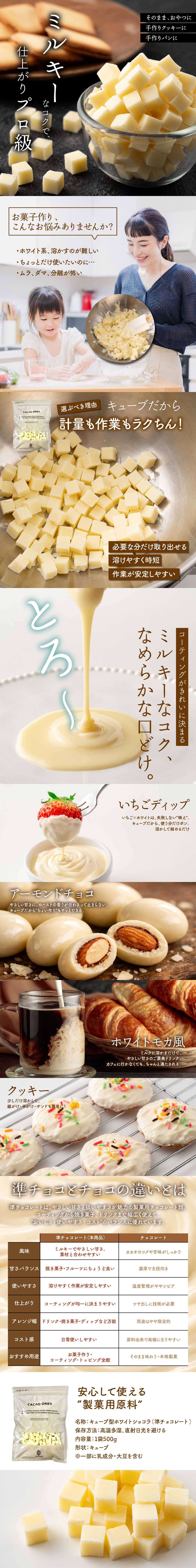 【500g】製菓用 (ホワイト)キューブタイプ 準チョコレート(コーティング・焼き菓子用) | ミルキーなコクが広がる、準チョコ。焼き菓子やフルーツにおすすめの甘さです♪