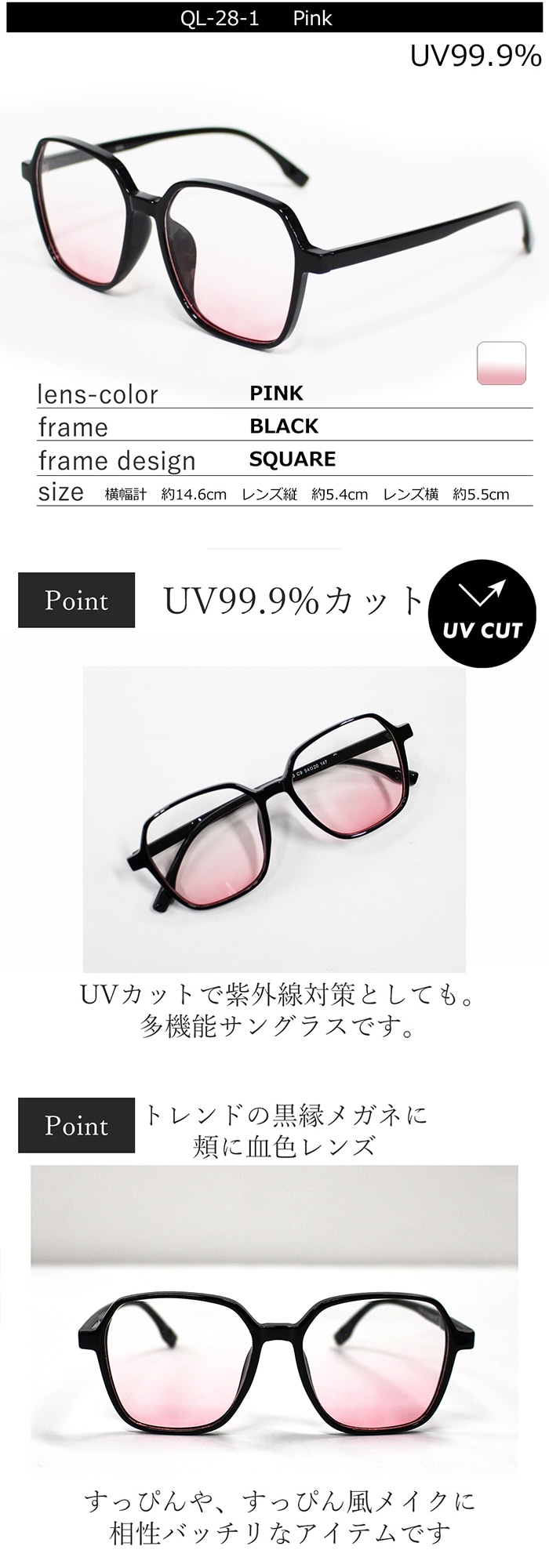 【血色レンズ】<ほんのりピンク> サングラス UVカット99.9% QL-28 | すっぴんでも肌色明るくトーンアップ!健康的な素肌に見えるUVサングラス