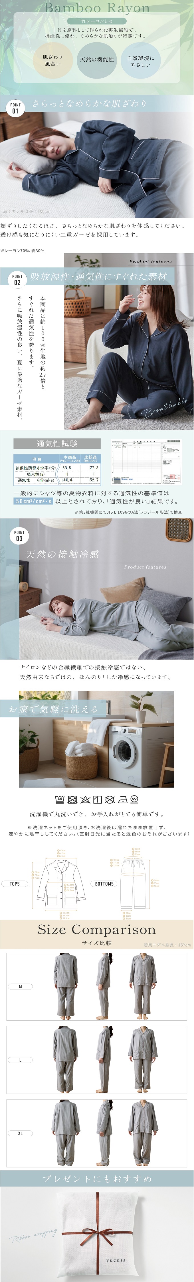 - 【XLサイズ/ミストグレー】ナイスデイ/竹レーヨンのしっとり2重ガーゼ パジャマ上下セット