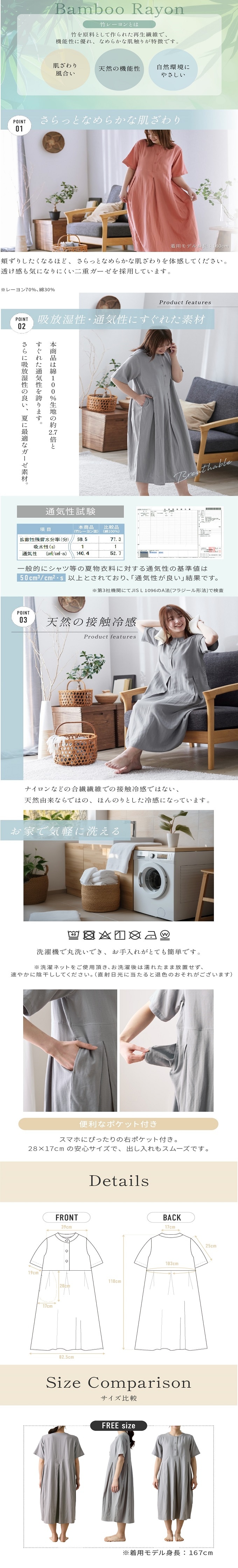 【フリーサイズ/サーモンピンク】ナイスデイ/yucuss 竹レーヨンのしっとり2重ガーゼワンピース | 透け感も気になりにくい2重ガーゼを採用。頬ずりしたくなるほど、さらっとなめらかな肌触りを。