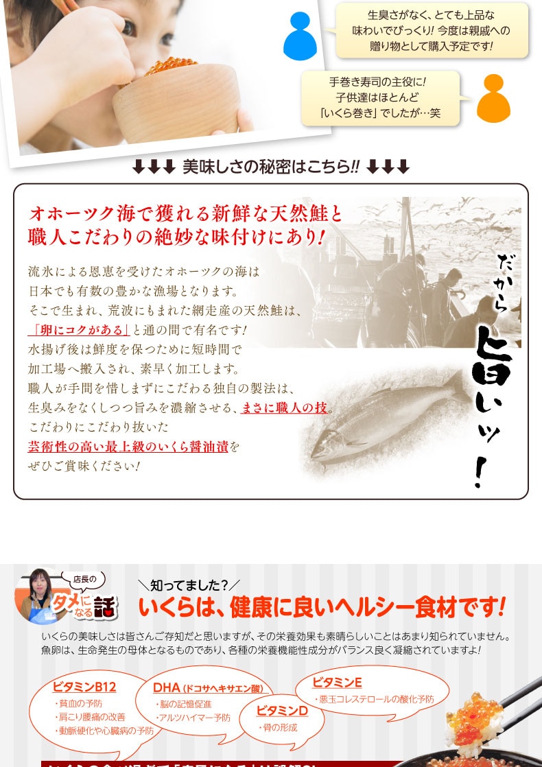 ・原材料/材質/素材:鮭卵(北海道オホーツク海産)、醤油、味醂、かつお節エキス、/調味料(アミノ酸等)、(一部に小麦・イクラ・大豆を含む)