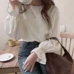 - 【ブルー】スクエアネックパフスリーブブラウス(長袖)
