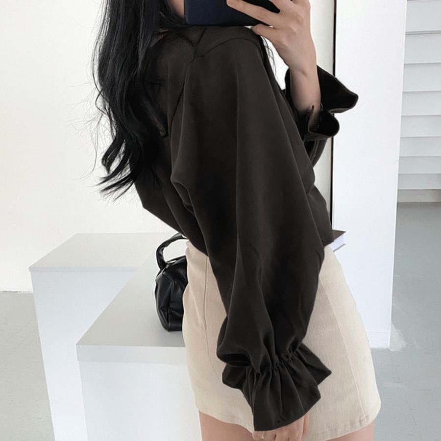 【ダークブラウン/Lサイズ】パフスリーブブラウス | 袖口が大人可愛いシャツブラウス