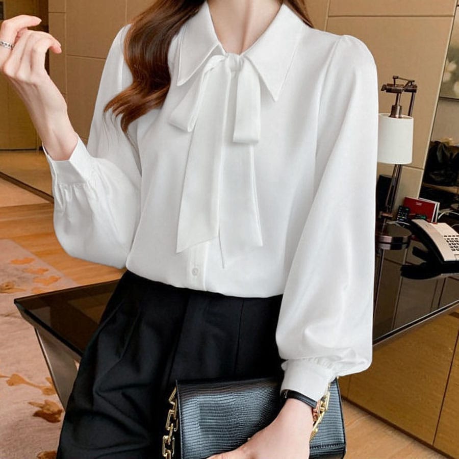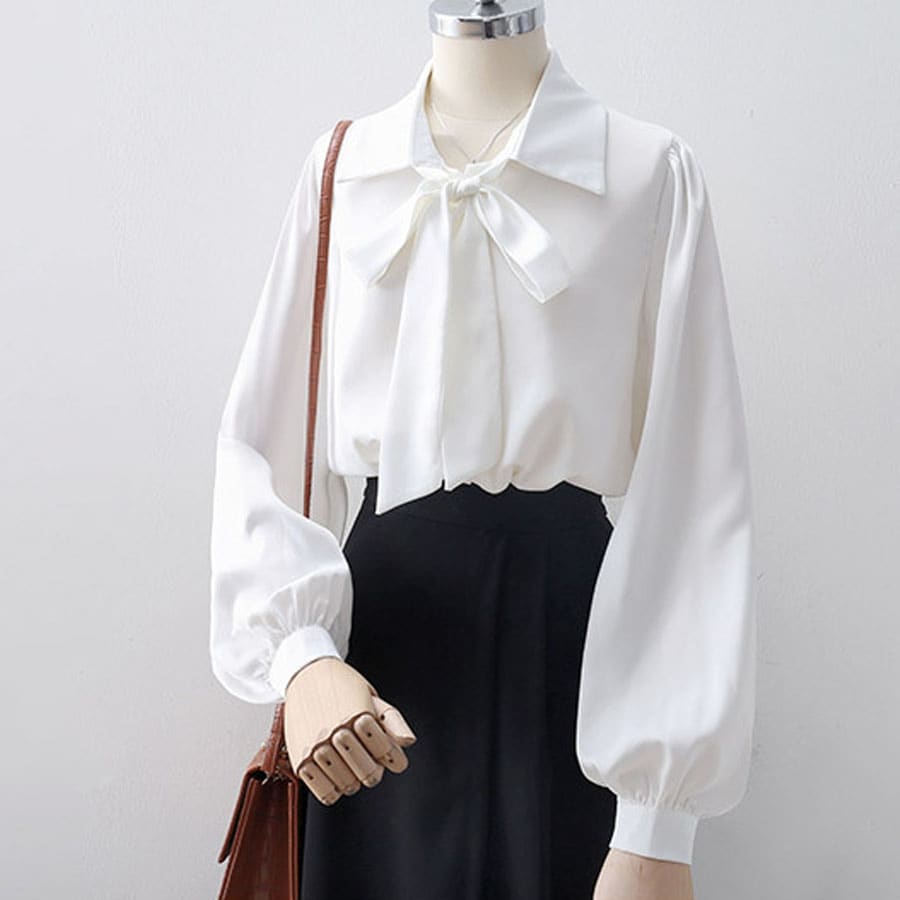 【ホワイト/Lサイズ】リボン付きシャツラウス | 大人かわいいリボン付きシャツブラウス