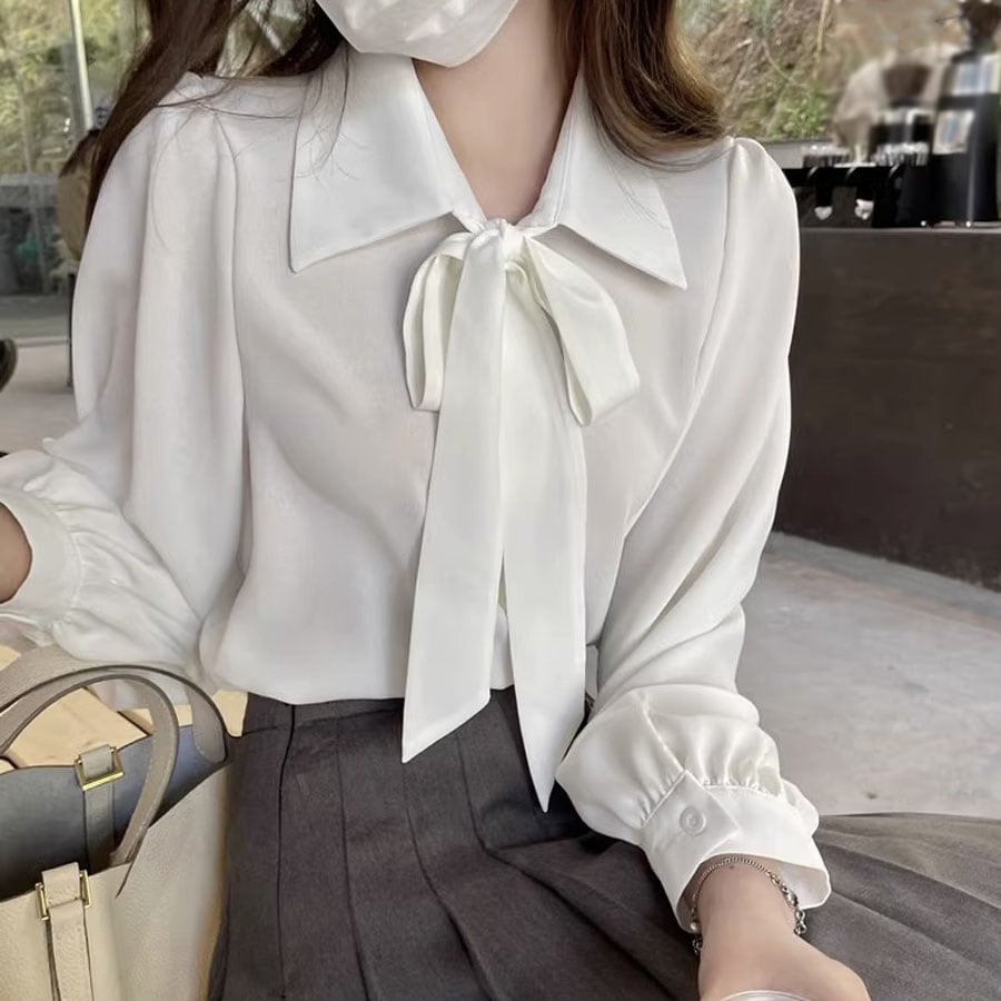 - 【ホワイト/Lサイズ】リボン付きシャツラウス