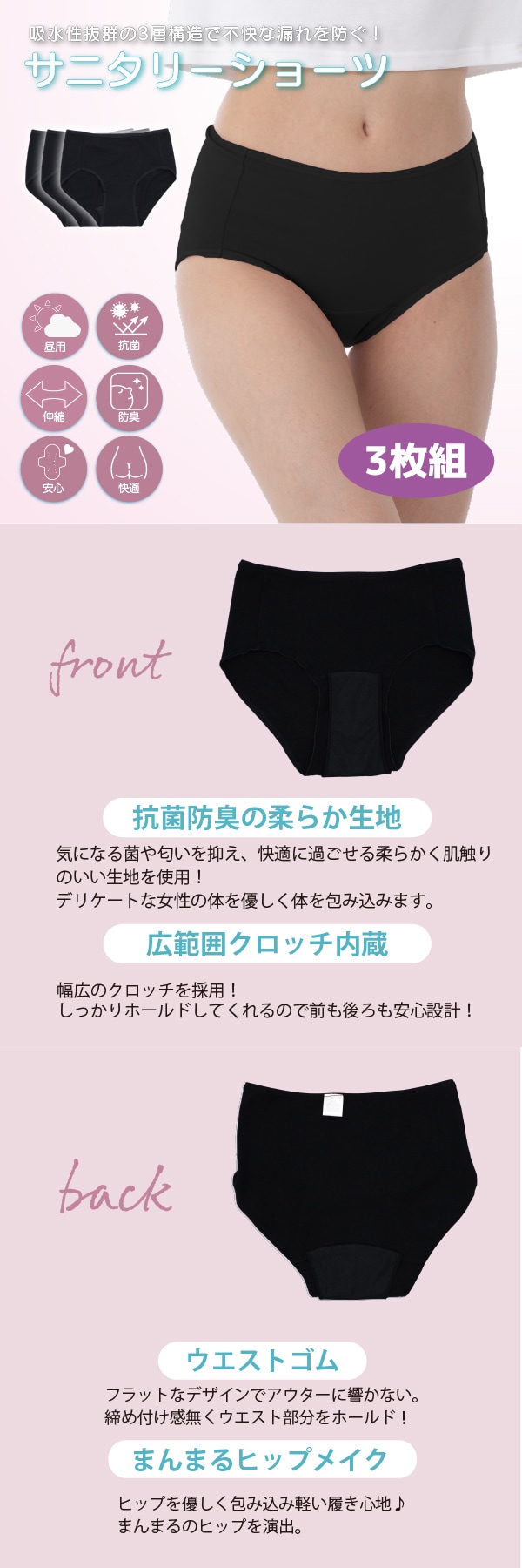 【ブラック/3L-4L/3枚組】エアーフィットサニタリーハイウエストショーツ | 履くだけで瞬間美尻