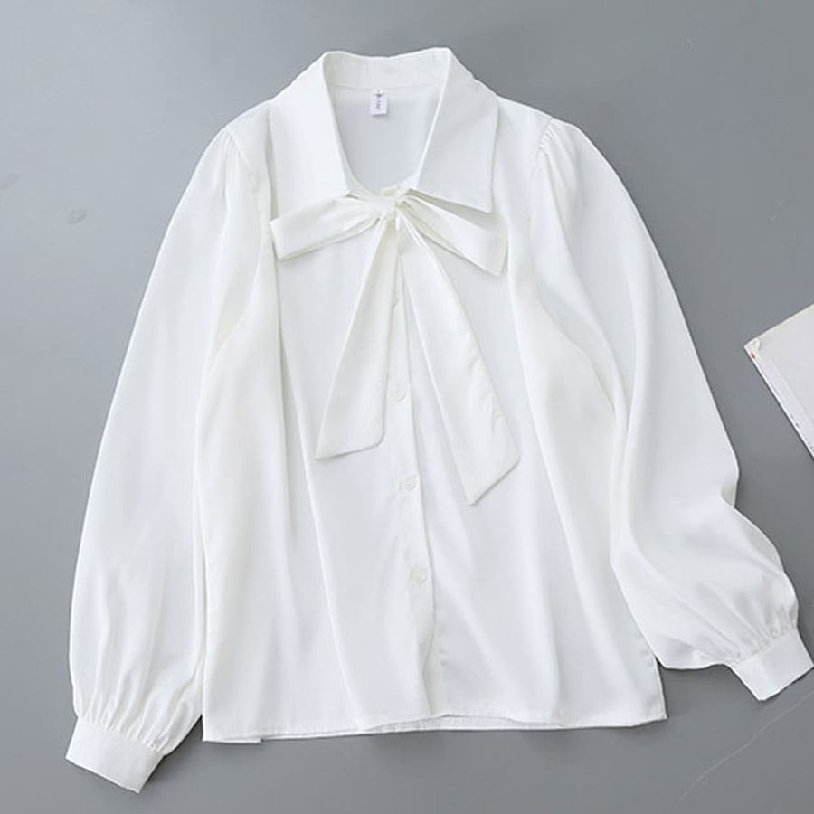 【ホワイト/Mサイズ】リボン付きシャツラウス | 大人かわいいリボン付きシャツブラウス