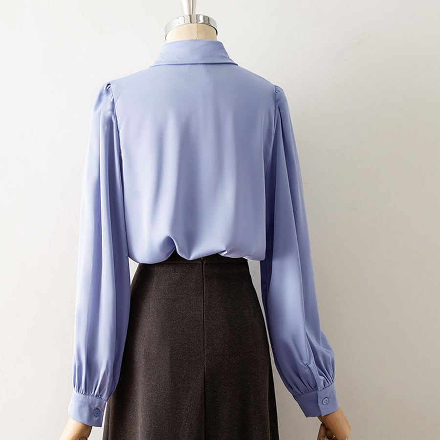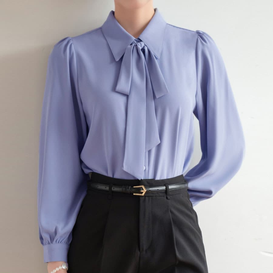 【ブルー/Mサイズ】リボン付きシャツラウス | 大人かわいいリボン付きシャツブラウス