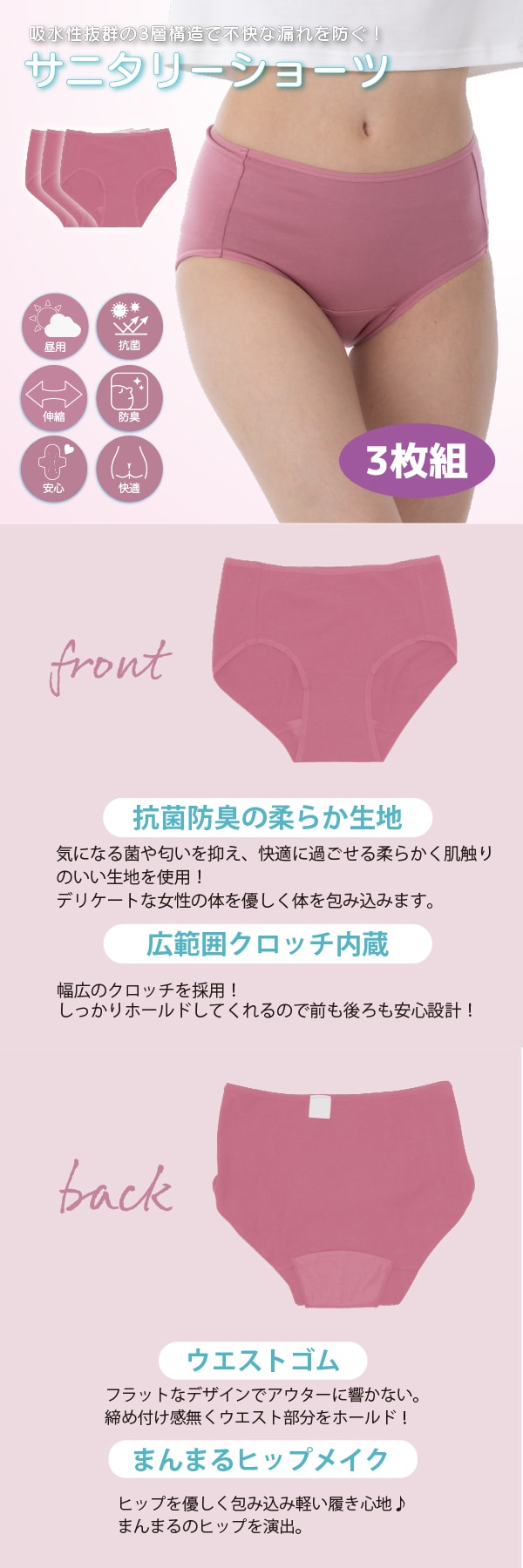 【ピンク/3L-4L/3枚組】エアーフィットサニタリーハイウエストショーツ | 履くだけで瞬間美尻