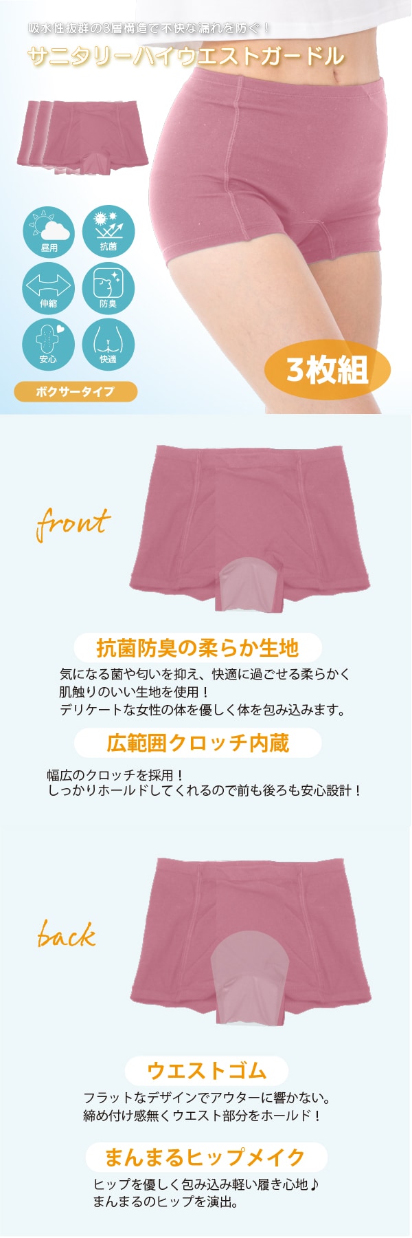 【ピンク/L-LL/3枚組】エアーフィットサニタリーハイウエストガードル | 3層ガードで安心。抗菌防臭×美尻シルエット