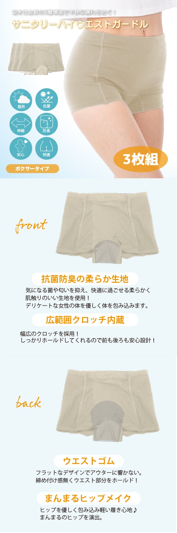 【ベージュ/S-M/3枚組】エアーフィットサニタリーハイウエストガードル | 3層ガードで安心。抗菌防臭×美尻シルエット