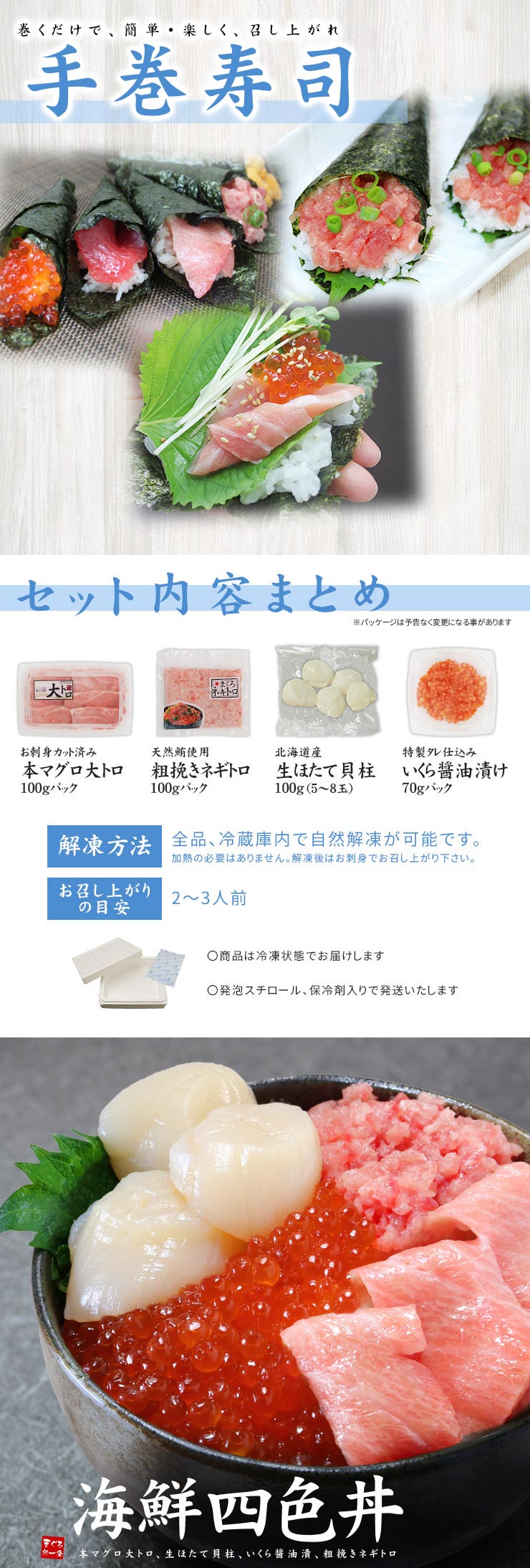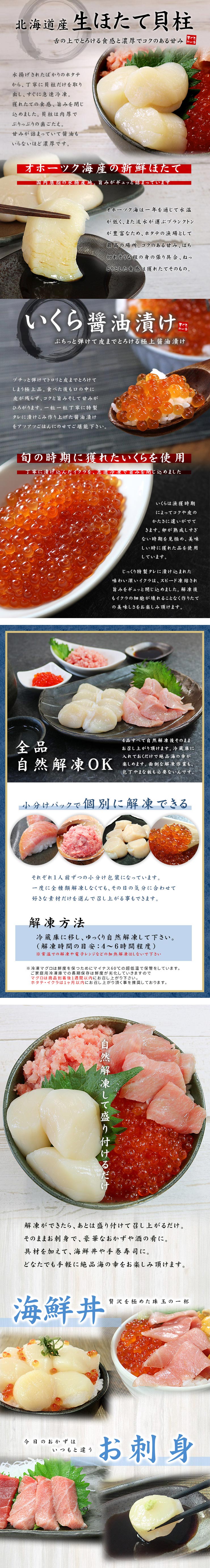 【計370g】海鮮四色丼セット マグロ 大トロ ほたて イクラ ネギトロ 刺身[[海鮮四色丼] | 包丁、まな板不要!自然解凍でそのまま食べられる(食べ物 海鮮丼 手巻き寿司)