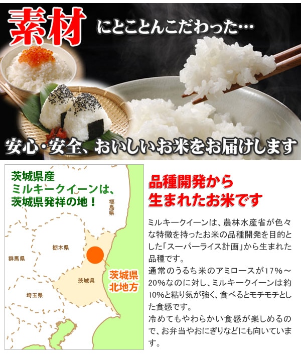 茨城県産ミルキークイーンは、普通のお米にもち米をかけあわせた品種で、冷めてもおいしい!