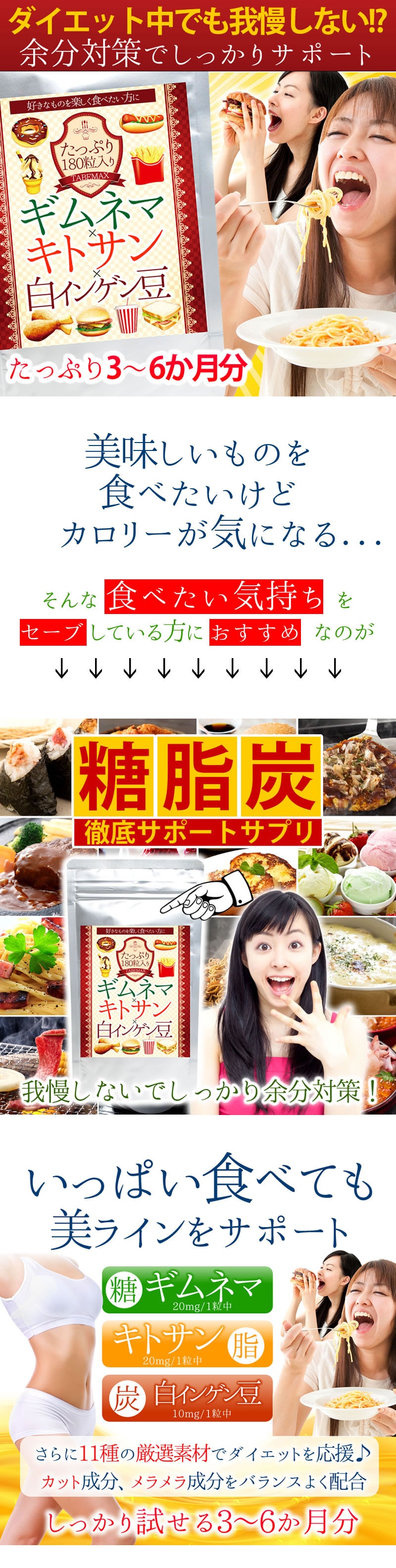 さまざまな食べ物のメニューにも対応してくれる厳選素材を配合!ギムネマ×キトサン×白インゲン豆を中心に、グァバ、生コーヒー豆抽出物、桑の葉、サラシア、ヒハツ、マンゴージンジャー、L-カルニチンなどサポート成分も充実!