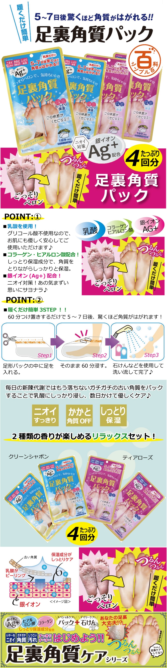 <シンプル百科>履くだけ簡単!足裏角質パック2種アソートセット(クリーンシャボン&ティアローズ) | 角質ごっそりベロンで、気持ちいい♪銀イオン(AG+)と保湿成分配合で肌に優しくしっかりケア