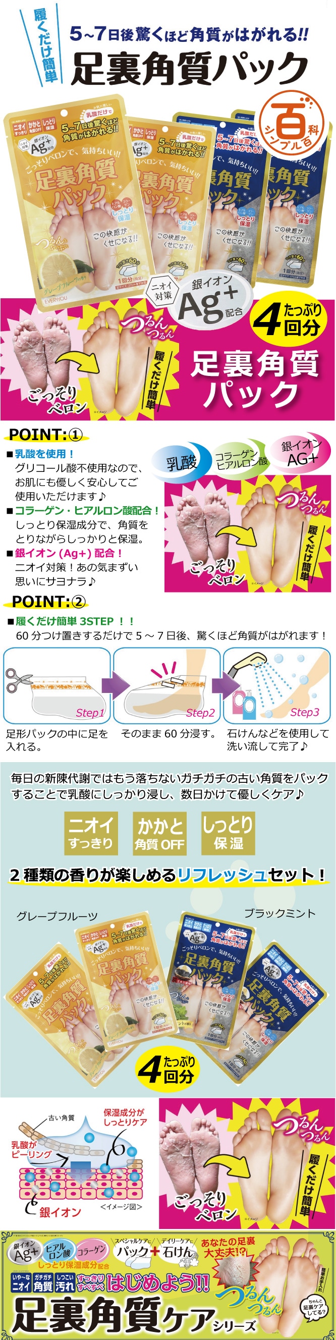 <シンプル百科>履くだけ簡単!足裏角質パック2種アソートセット(グレープフルーツ&ブラックミント) | 角質ごっそりベロンで、気持ちいい♪銀イオン(AG+)と保湿成分配合で肌に優しくしっかりケア