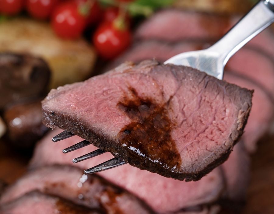 北海道産の牛モモ肉で作るローストビーフは、肉の旨みの濃さを生かした塩と胡椒のみのシンプルな味付けです。低温で火入れしているので、しっとりとした赤身肉は、かむと肉汁がジュワっと流れます。