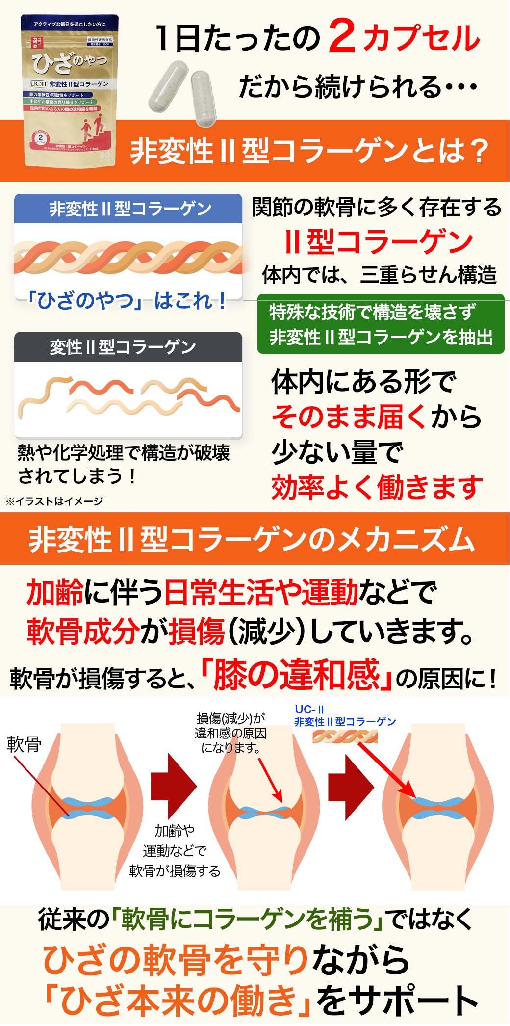 「ココカラダ ひざのやつ 非変性2型コラーゲン」は、ひざ関節が気になる方の機能性表示食品(届出表示番号 J506)です。運動習慣がある方の膝の違和感を軽減し、膝の柔軟性・可動性をサポートします。また、中高年の階段の昇り降りをサポートします。毎日をアクティブに過ごしたい方のひざ関節サポートにおすすめです。またグルコサミンで満足できなかった方にもおすすめです。