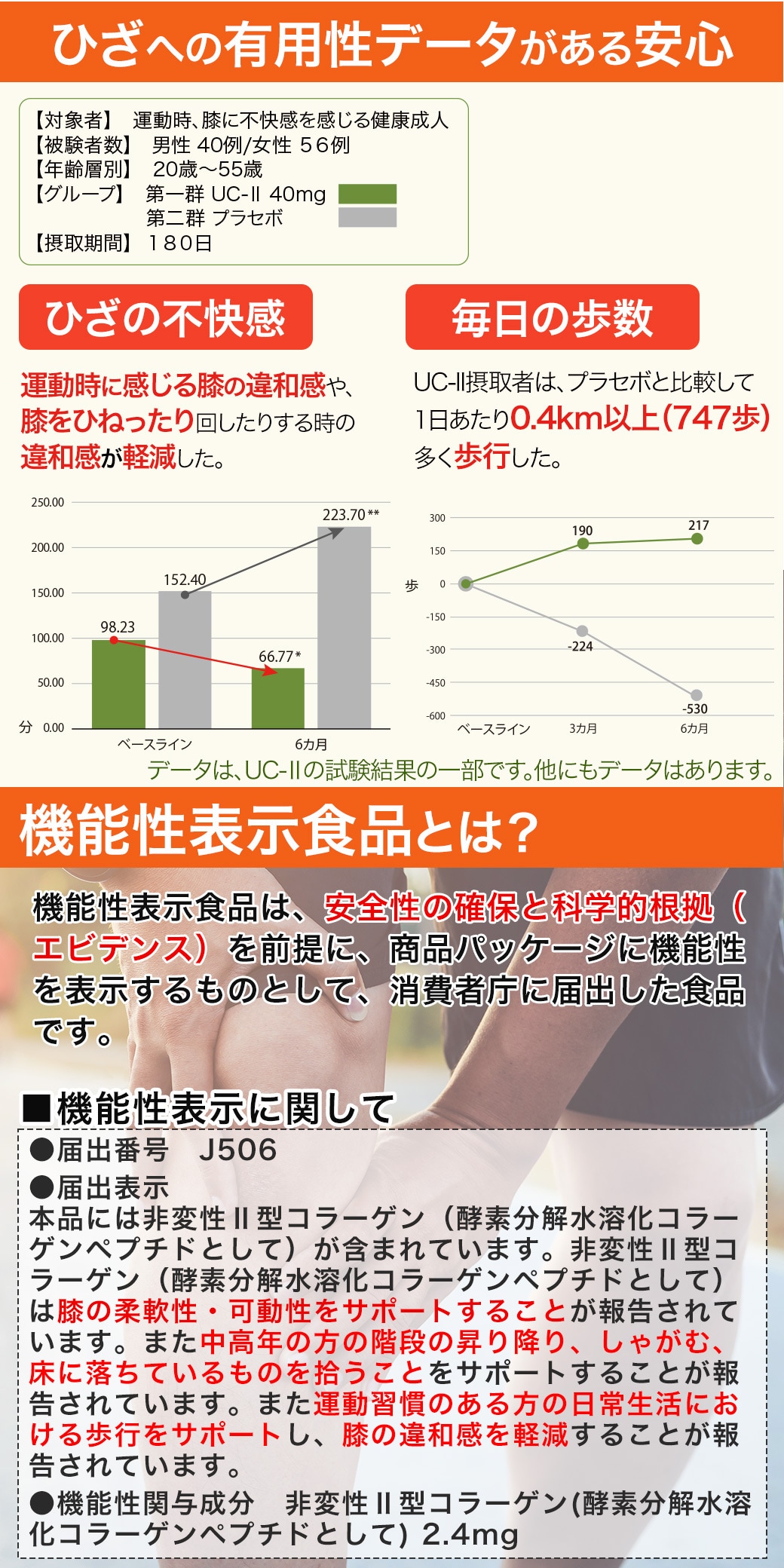 本品には非変性2型コラーゲン(酵素分解水溶化コラーゲンペプチドとして)が含まれています。非変性2型コラーゲン(酵素分解水溶化コラーゲンペプチドとして)は膝の柔軟性・可動性をサポートすることが報告されています。また中高年の方の階段の昇り降り、しゃがむ、床に落ちているものを拾うことをサポートすることが報告されています。また運動習慣のある方の日常生活における歩行をサポートし、膝の違和感を軽減することが報告されています。
