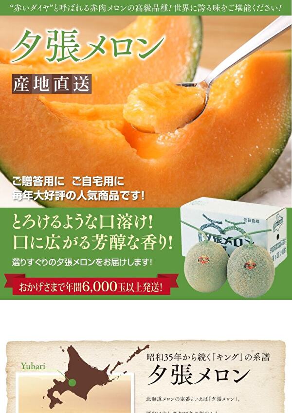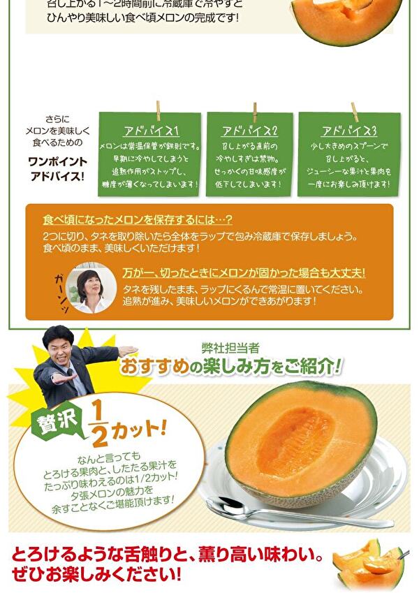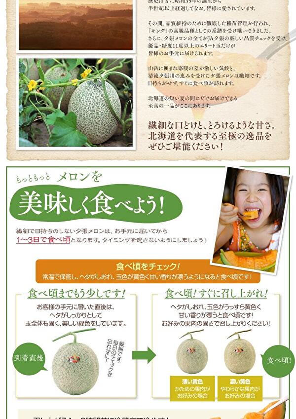 ・その他商品仕様:夕張メロンは肉質が柔らかすぎるため、他のメロンを食べなれているお客様から「食べ頃が過ぎているのでは?」と問い合わせを頂くことがありますが、夕張メロンは品種的にも他のメロンとは違い「熟し過ぎ?」「傷んでいる?」などと誤解されるほど大変柔らかくジューシーなメロンなのです。