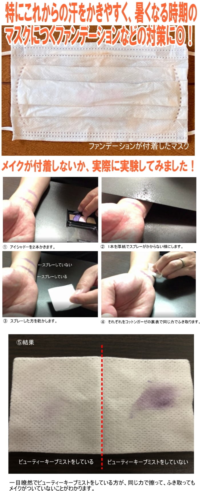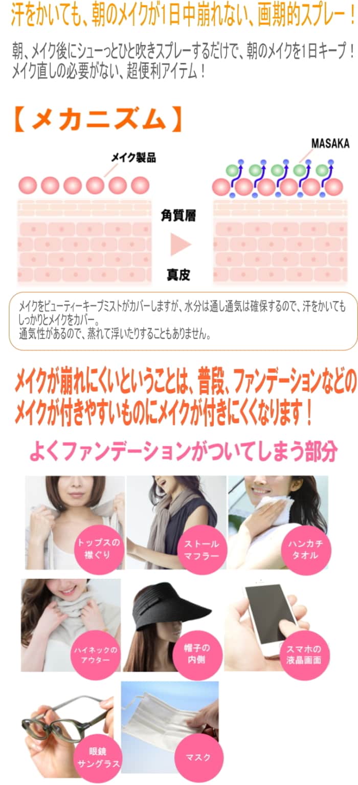 どうしてもメイクをしてマスクをすると、特にこれから暑くなり、汗をかく時期、マスクにべっとりとファンデーションなどのメイクが付着してしまいますが、マサカ ビューティーキープミストをしておけば、マスクにメイクが付着しにくくなるので、衛生的で洗濯しやすくオススメです。