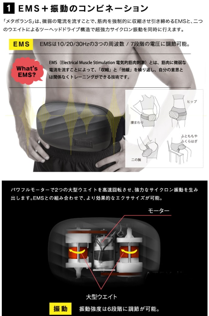 微弱な電流を流すことで筋肉を収縮させ引き締めるEMSとパワフルな振動を同時に行える機器です。