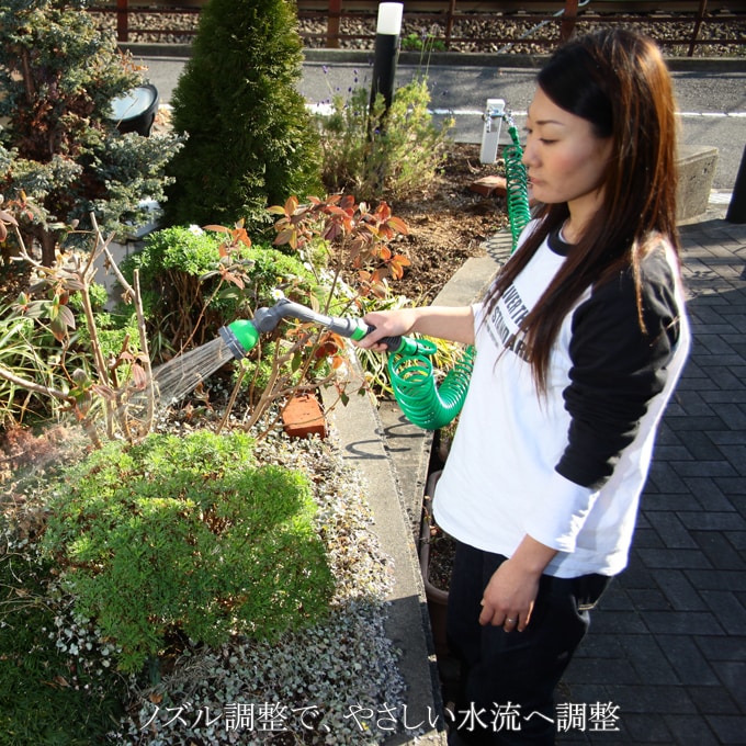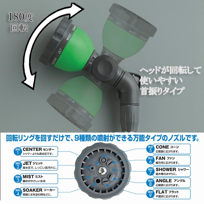 可変式ノズル、9種類の噴射、ON・OFFのワンタッチスイッチ、ワンタッチコネクターなど便利な機能が付いています。