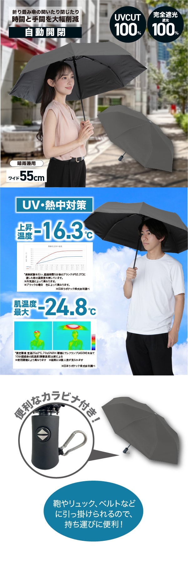 【ダークグレー】自動開閉式日傘カラビナ付き | ワンプッシュですぐに開ける!