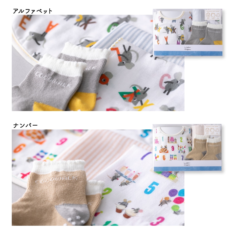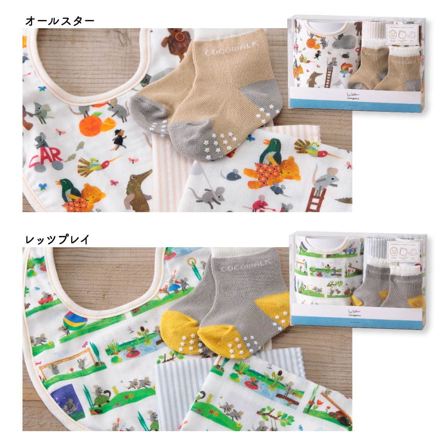 滑り止め付きのソックスと、スタイとミニハンカチ2枚がセットに!