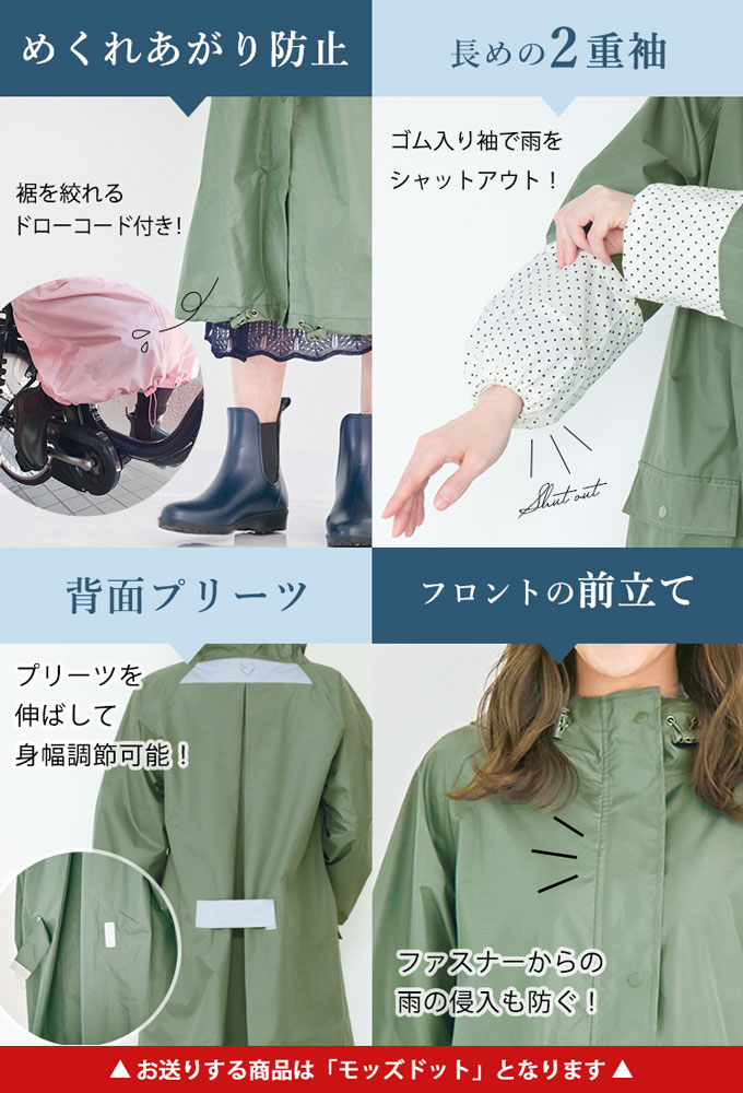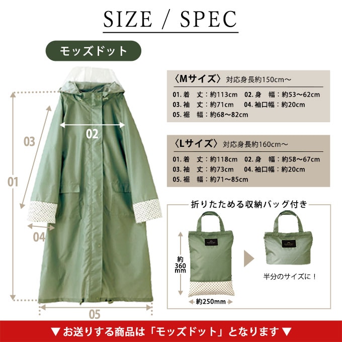 ロング レインコート 【モッズドット Lサイズ】シュシュポッシュ シンプルデザイン 雨具 | 自転車通勤・通学の必需品!透明ツバが雨を防ぎ、視界を守って安全運転!収納袋付で持ち運び◎