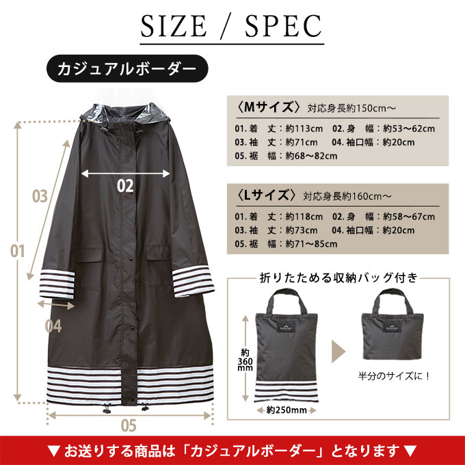 ロング レインコート 【カジュアルボーダー Mサイズ】 シュシュポッシュ レインウエア 雨具 黒 | 自転車での通勤・通学の必需品!透明ツバが雨を防ぎ、視界を守って安全運転!収納袋で持ち運び◎