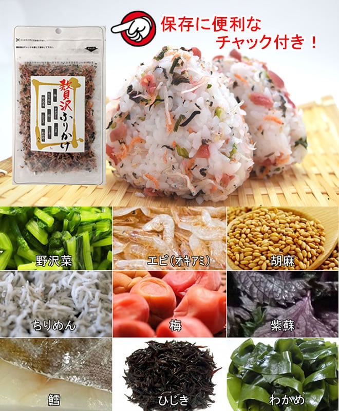 梅・紫蘇・エビ(オキアミ)・ちりめん・鱈・ひじき・野沢菜・わかめ・胡麻、