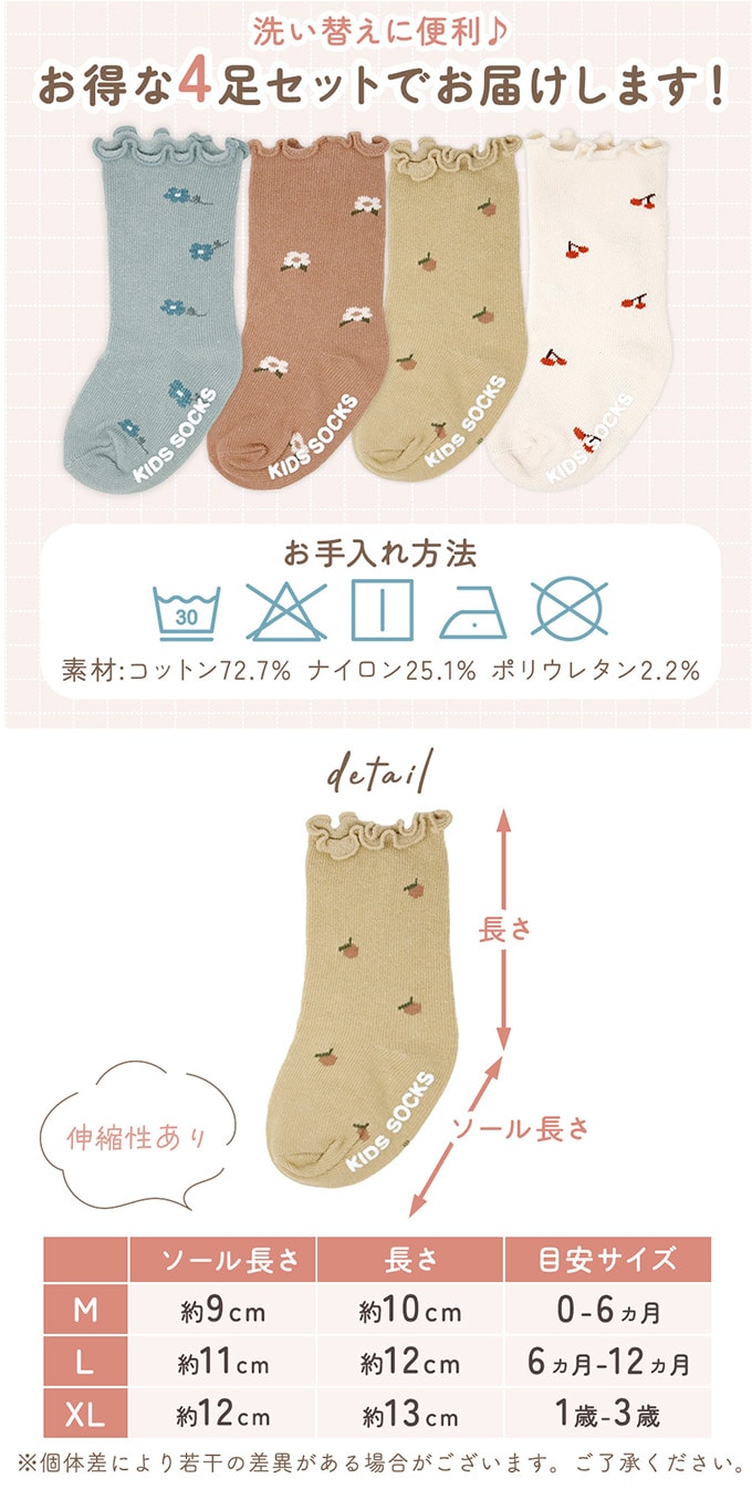 [Mサイズ/0-6か月目安]キッズガールズソックス 【4足セット】 | メロウフリル×ニュアンスカラーがかわいい!滑り止め付きソックス