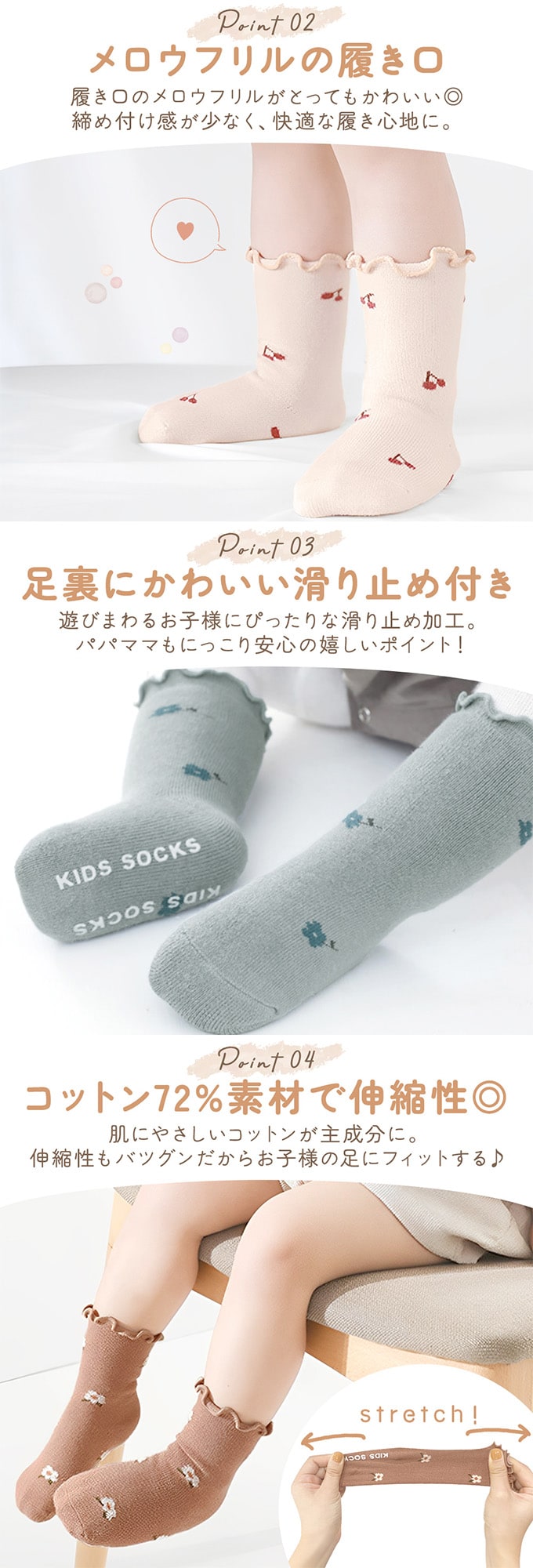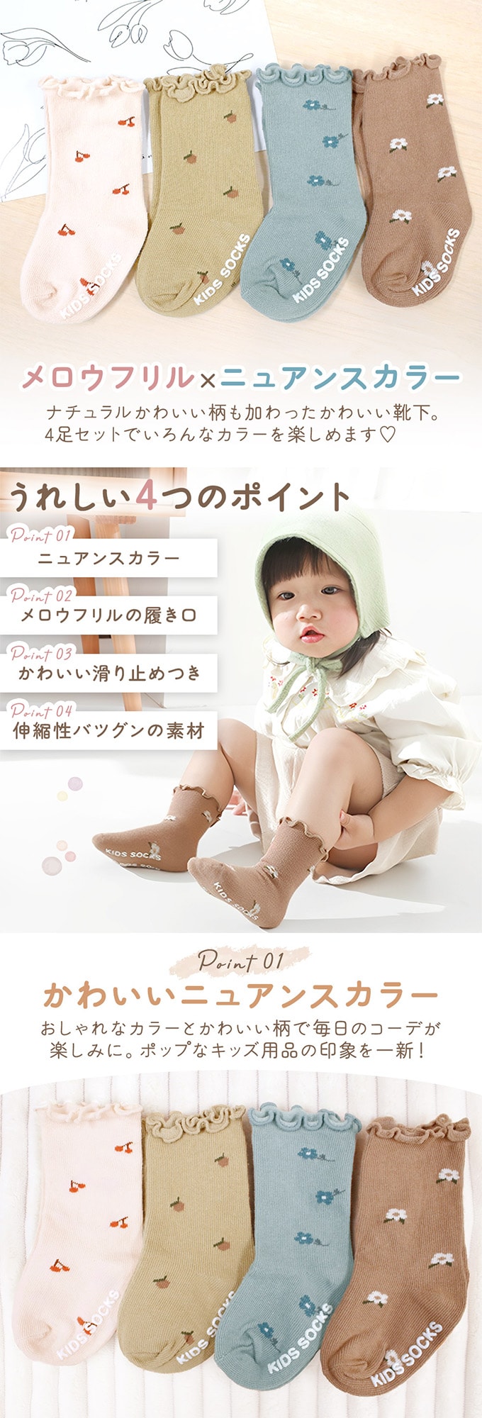 [XLサイズ/1-3歳目安]キッズガールズソックス【4足セット】 | メロウフリル×ニュアンスカラーがかわいい!滑り止め付きソックス