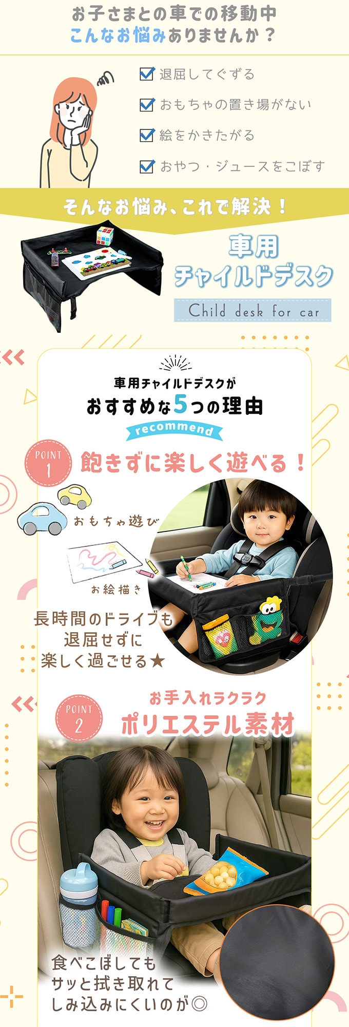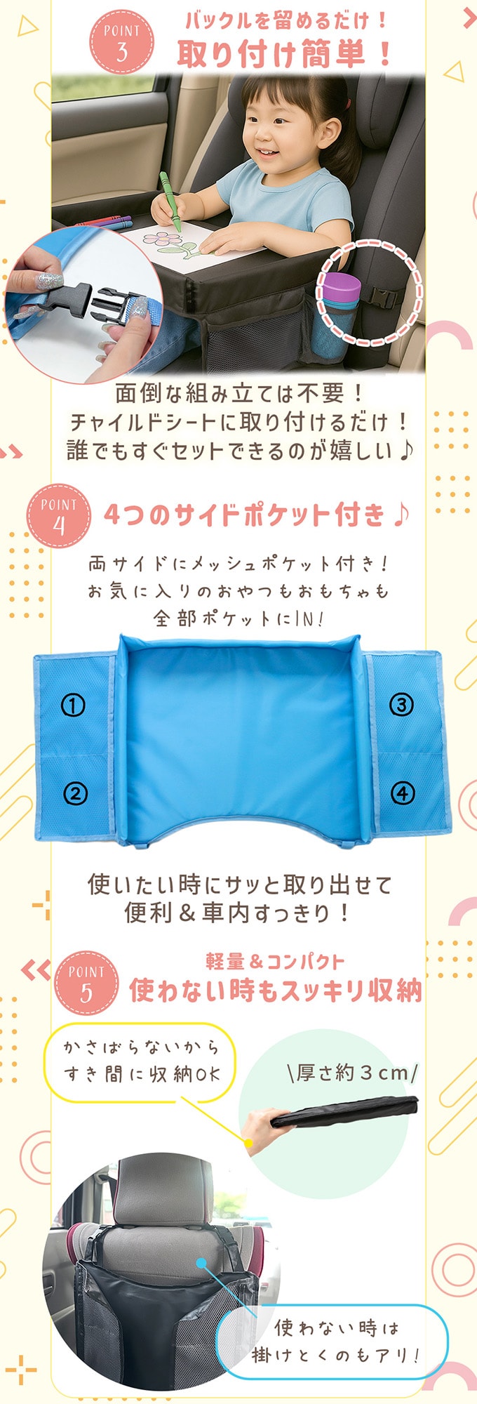 ・車内でのお絵かきや食事が快適に!お出かけがもっと楽しくなるようなアイテム