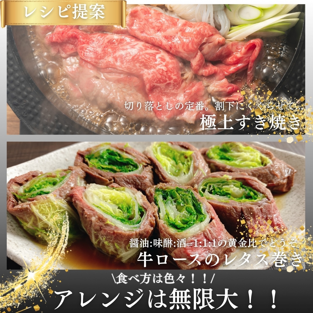 2.食卓を彩るごちそう感と多様な調理法: すき焼きやしゃぶしゃぶで家族団らんの主役に。また、さっと炒めて牛丼や肉巻きにするなど、日常使いも特別な日も、様々な料理で食卓を豊かにします。