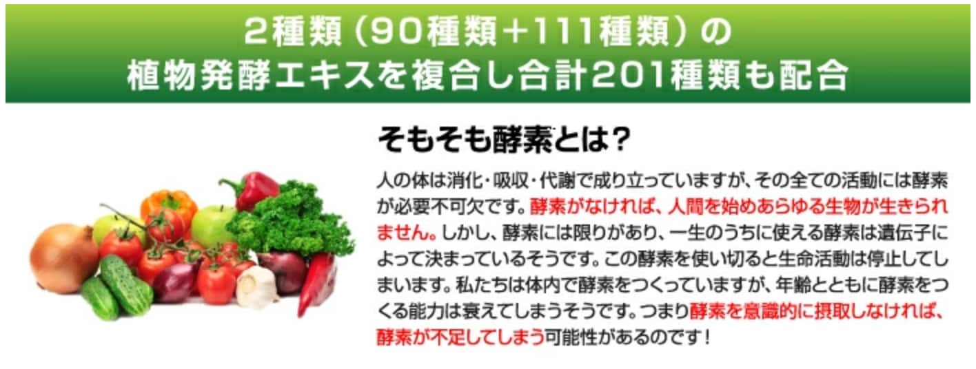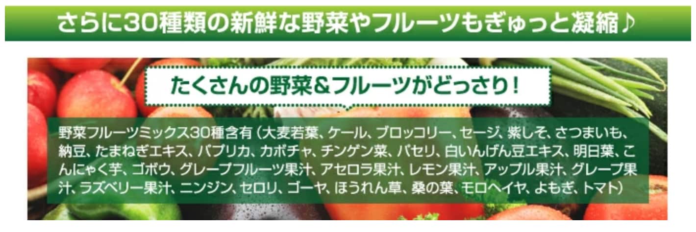 ・原材料/材質/素材:水溶性食物繊維、野草発酵エキス(90成分含有)、植物発酵エキス(111成分含有)、 野菜フルーツミックス末((30種含有)(大麦若葉、ケール、ブロッコリー、セージ、紫しそ、さつまいも、納豆、たまねぎエキス、パプリカ、カボチャ、チンゲン菜、パセリ、白いんげん豆エキス、明日葉、こんにゃく芋、ゴボウ、グレープフルーツ果汁、アセロラ果汁、レモン果汁、アップル果汁、グレープ果汁、ラズベリー果汁、ニンジン、セロリ、ゴーヤ、ほうれん草、桑の葉、モロヘイヤ、よもぎ、トマト)、セルロース、ショ糖脂肪酸エステル、微粒二酸化ケイ素、V.C、ナイアシン、パントテン酸Ca、V.E、V.B1、V.B2、V.B6、V.A、V.D、V.B12、葉酸 (リンゴ、やまいも含有)