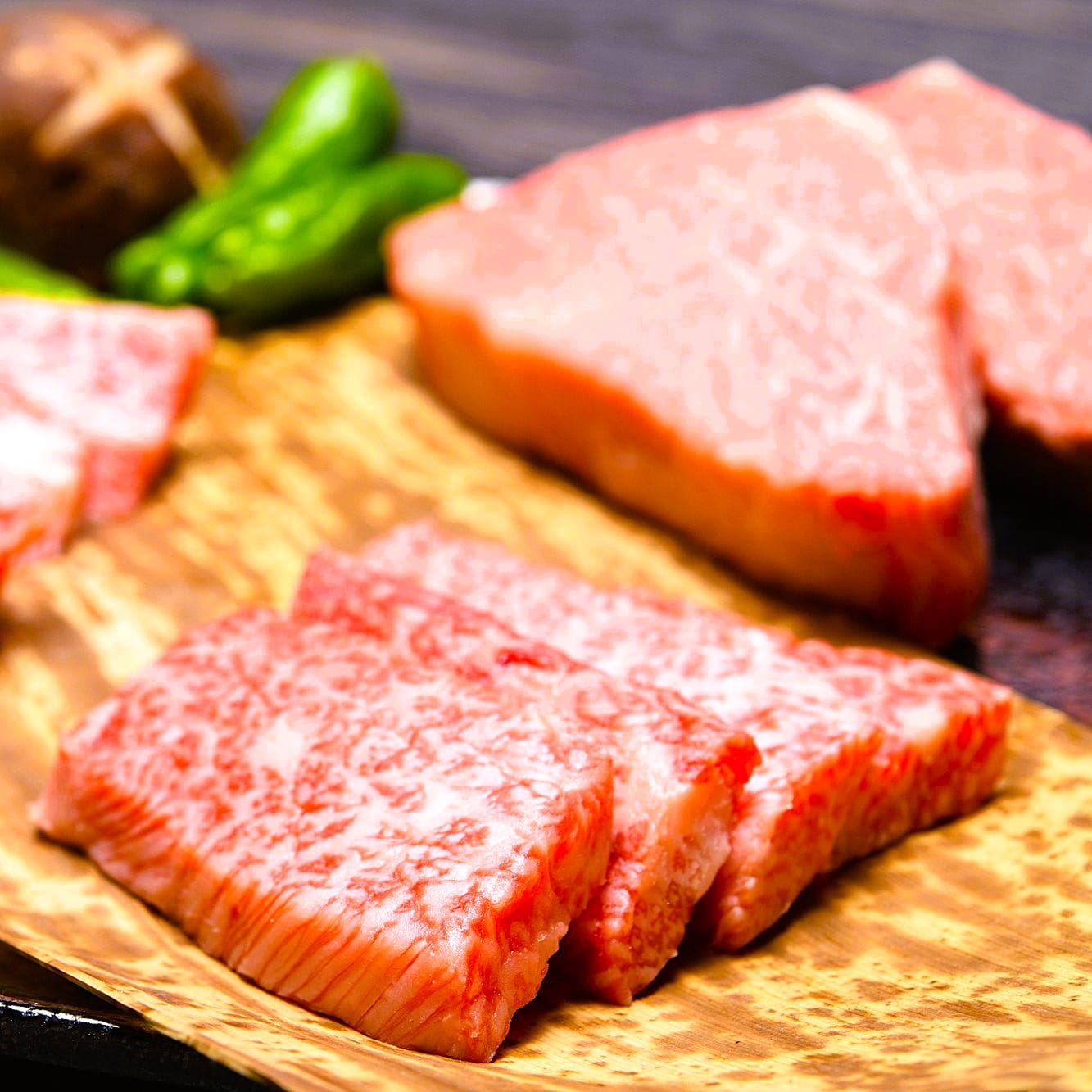 1.【とろける脂と肉の旨み】きめ細やかな霜降りが溶け出す肩ロースと、濃厚な肉の旨みが凝縮されたバラ肉。両方の魅力を一度に味わえます。