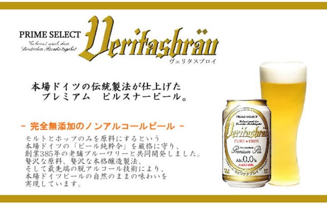 「ヴェリタスブロイ(Veritasbrau)ピュア&フリー」は、本場ドイツで「ビール純粋令」を厳格に守る創業385年の老舗ブルーワリーと共同で開発されたノンアルコールビールです。原料はプレミアムモルト、ファインホップと天然水のみで、添加物は一切使用しておりません。