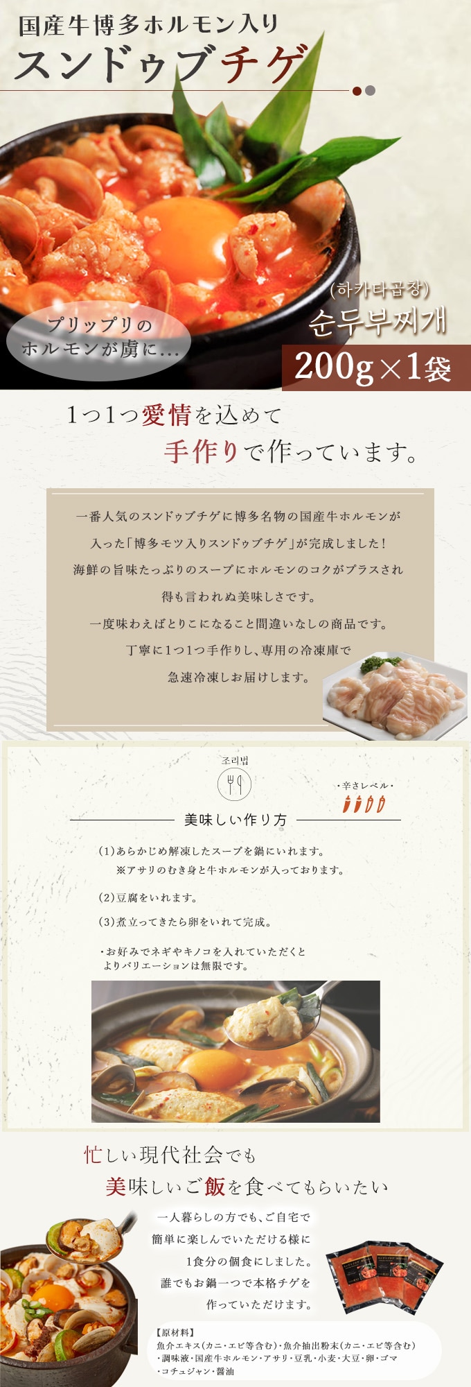 ・原材料/材質/素材:魚介エキス(カニ・エビ等含む)・魚介抽出粉末(カニ・エビ等含む)・調味液・国産牛ホルモン・アサリ・豆乳・小麦・大豆・卵・ゴマ・コチュジャン・醤油