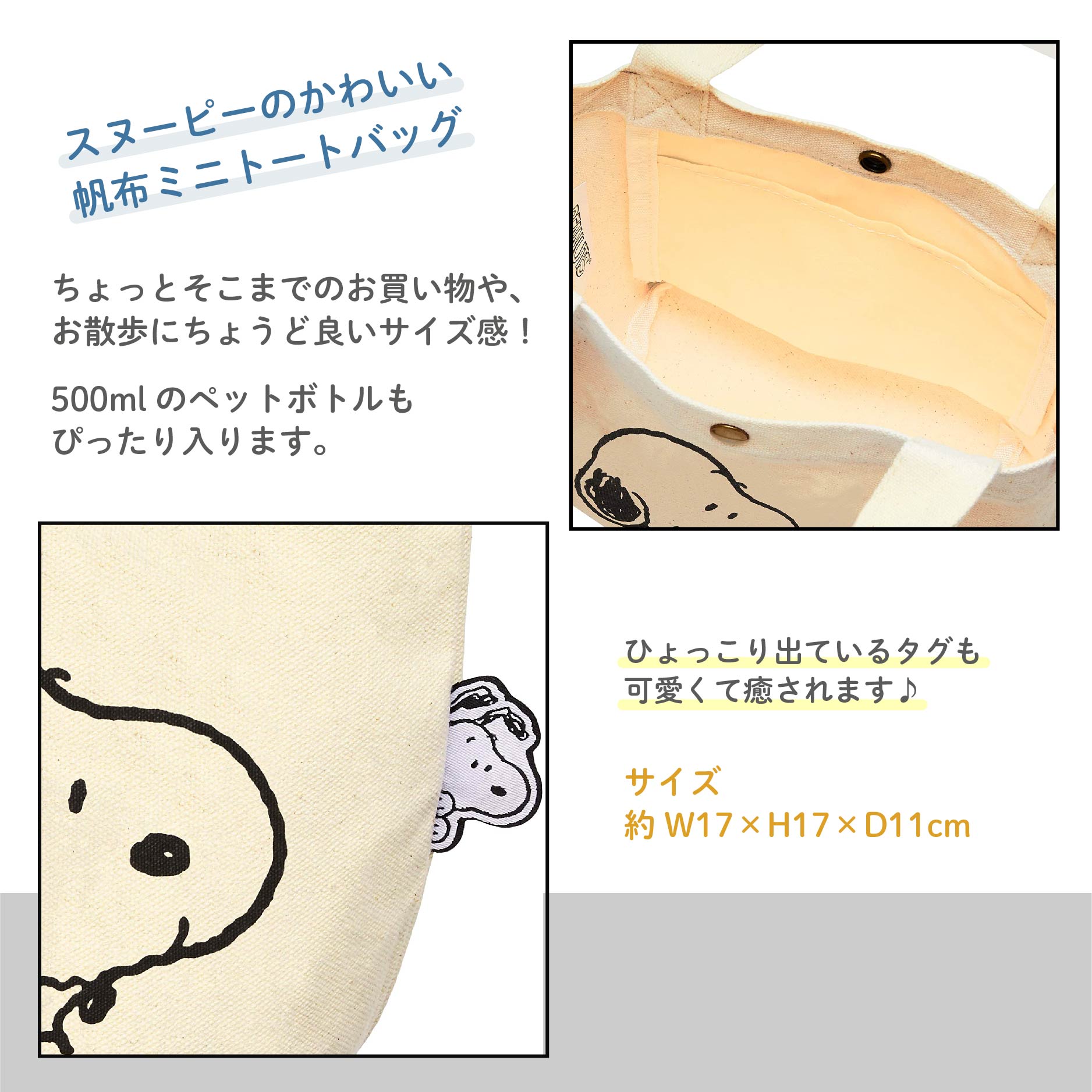 【ウッドストックフェイス】PEANUTS スヌーピー 帆布ミニトートバッグ SNP6015 | スヌーピーたちのプリントが可愛いミニトートバッグ。