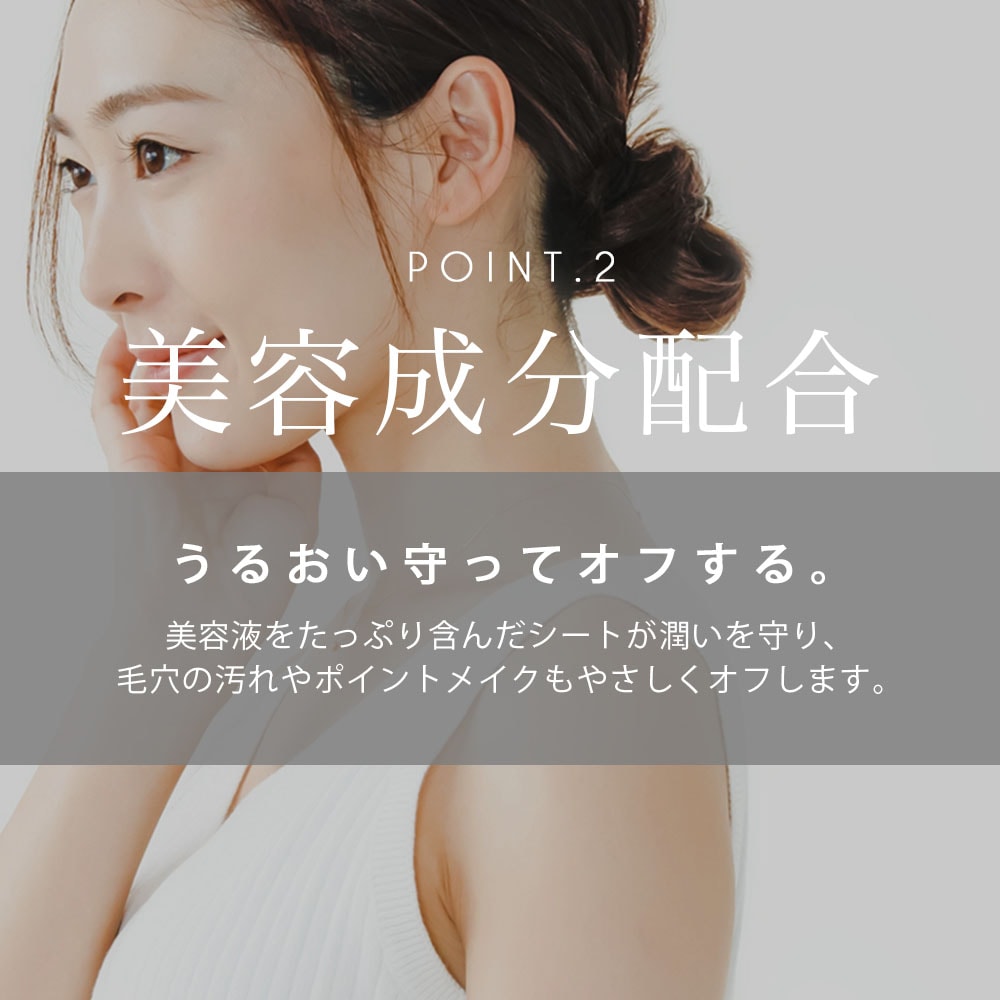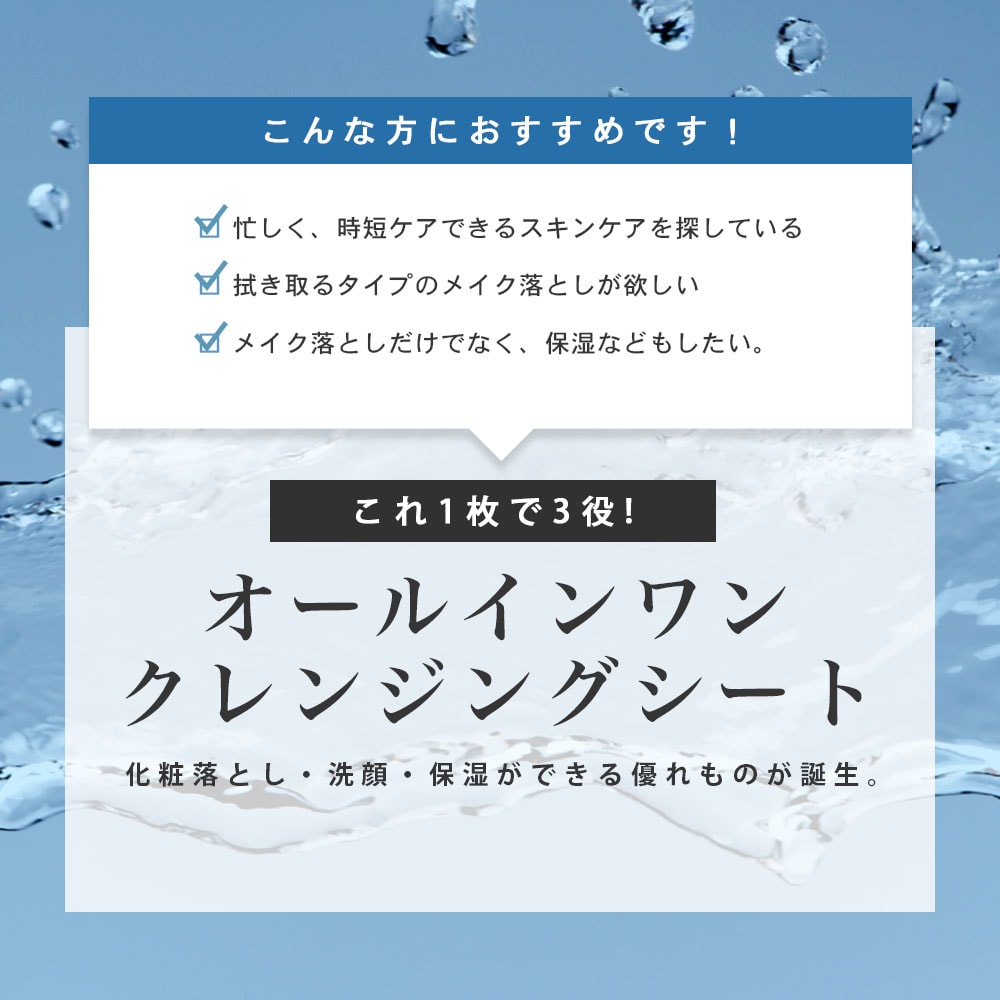 天然由来の美容成分をふんだんに配合した、1枚で落とせるダブル洗顔不要のクレンジングシートです。 お肌にも優しく、美容液たっぷりのシートで潤いを守り、拭き取るだけで毛穴やポイントメイクもやさしくオフ。 クレンジングだけではなく、洗顔、保湿、ソフトピーリングまでこなす、1枚4役のオールインワンコットンシート。