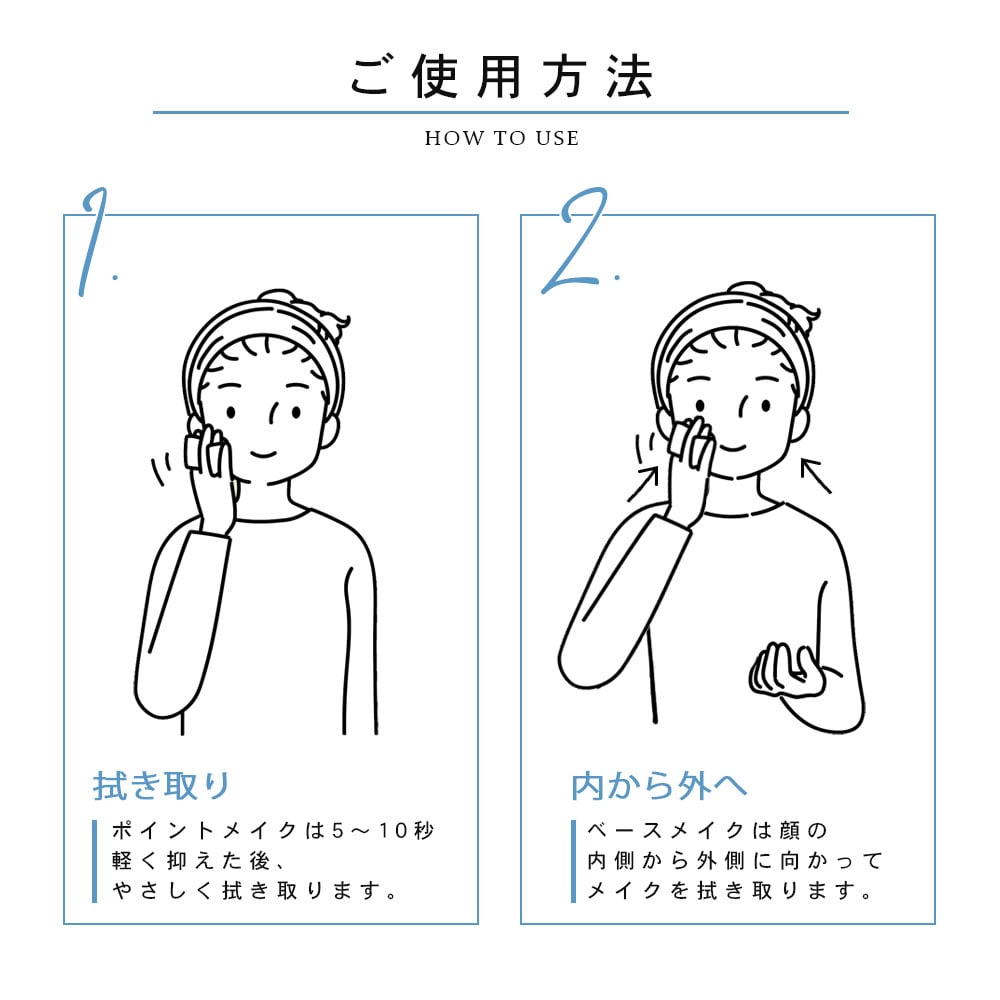 【拭き取り】 ポイントメイクは、5から10秒ほど軽く抑えた後、やさしく拭き取ります。